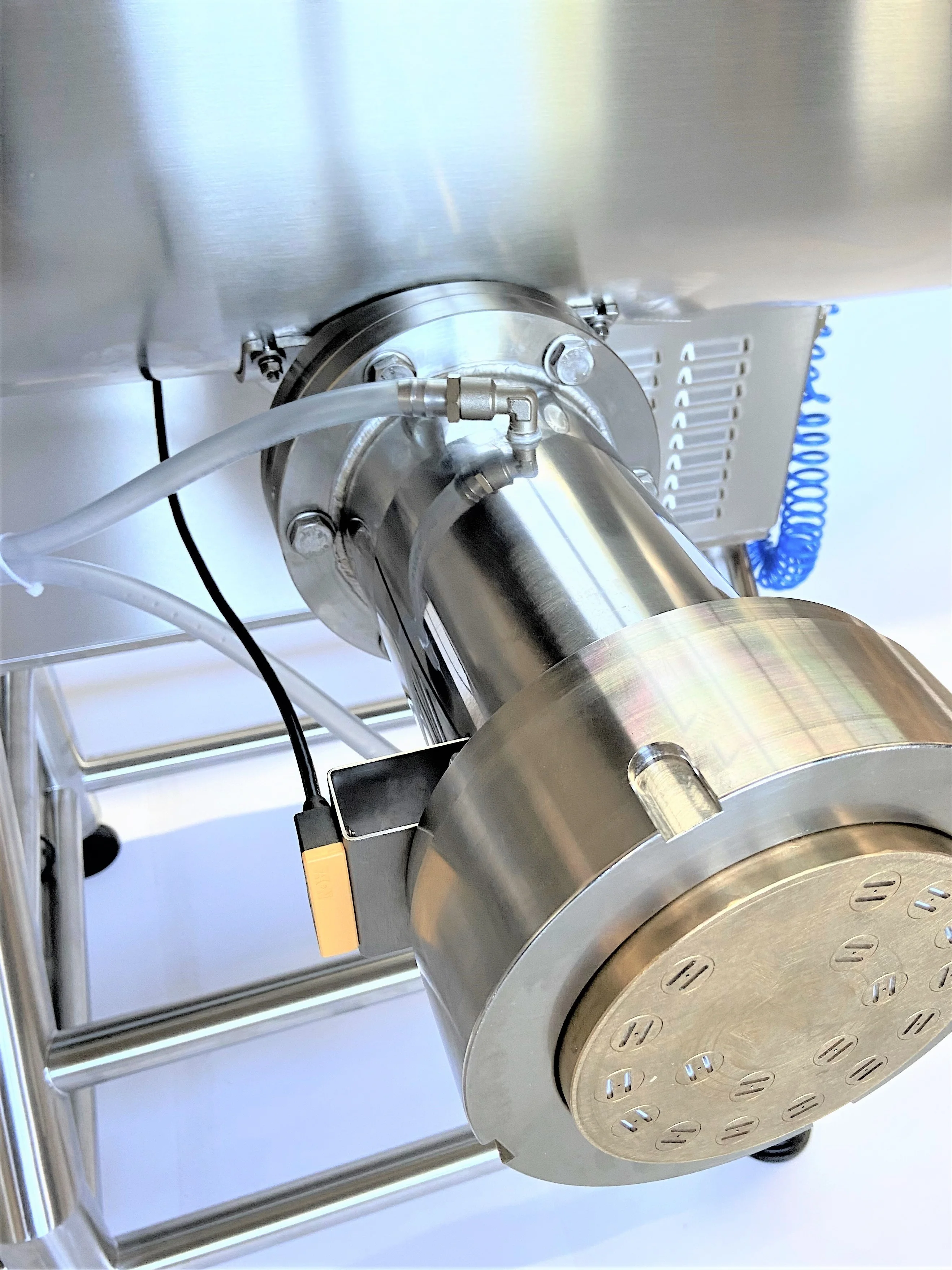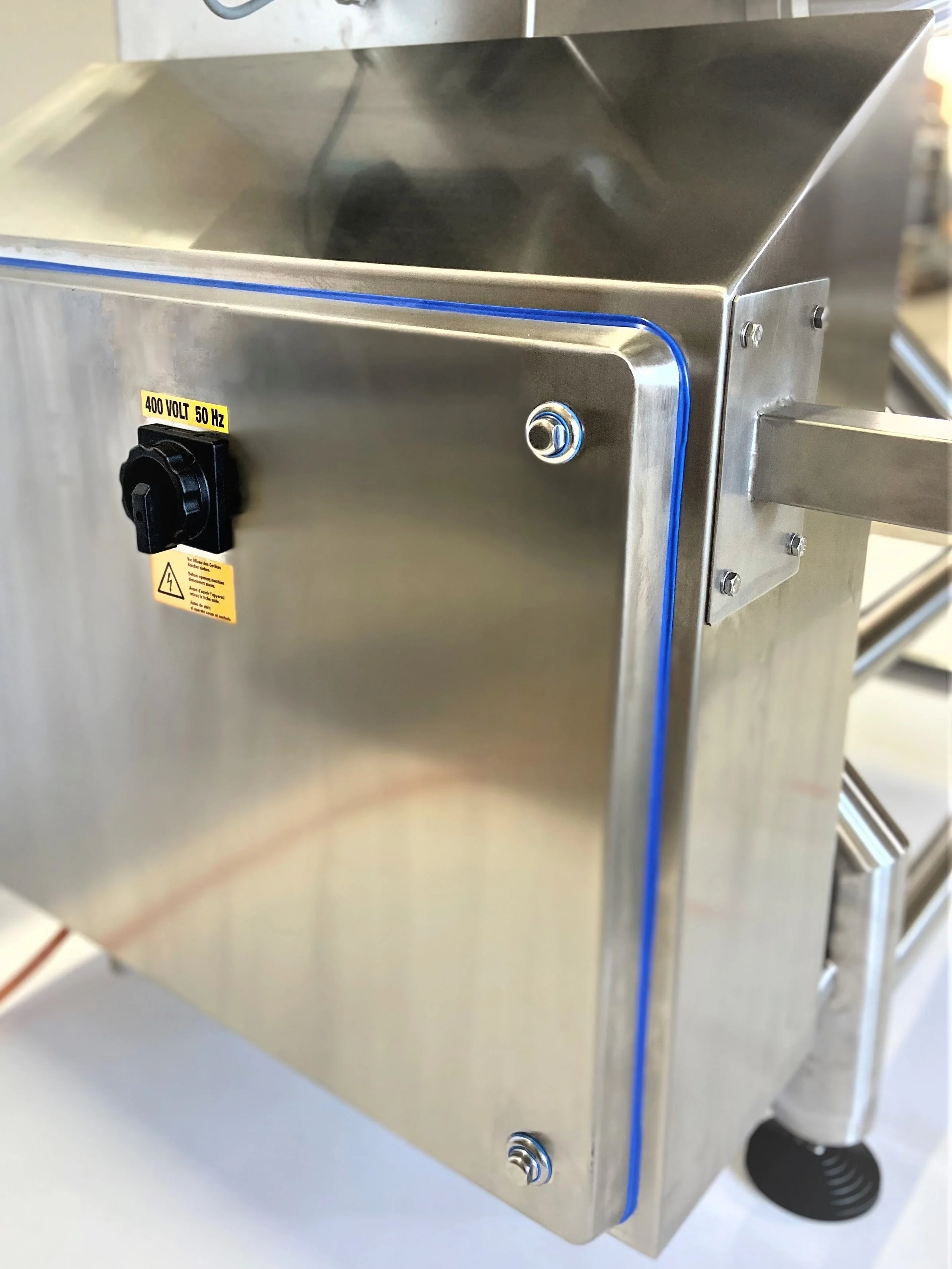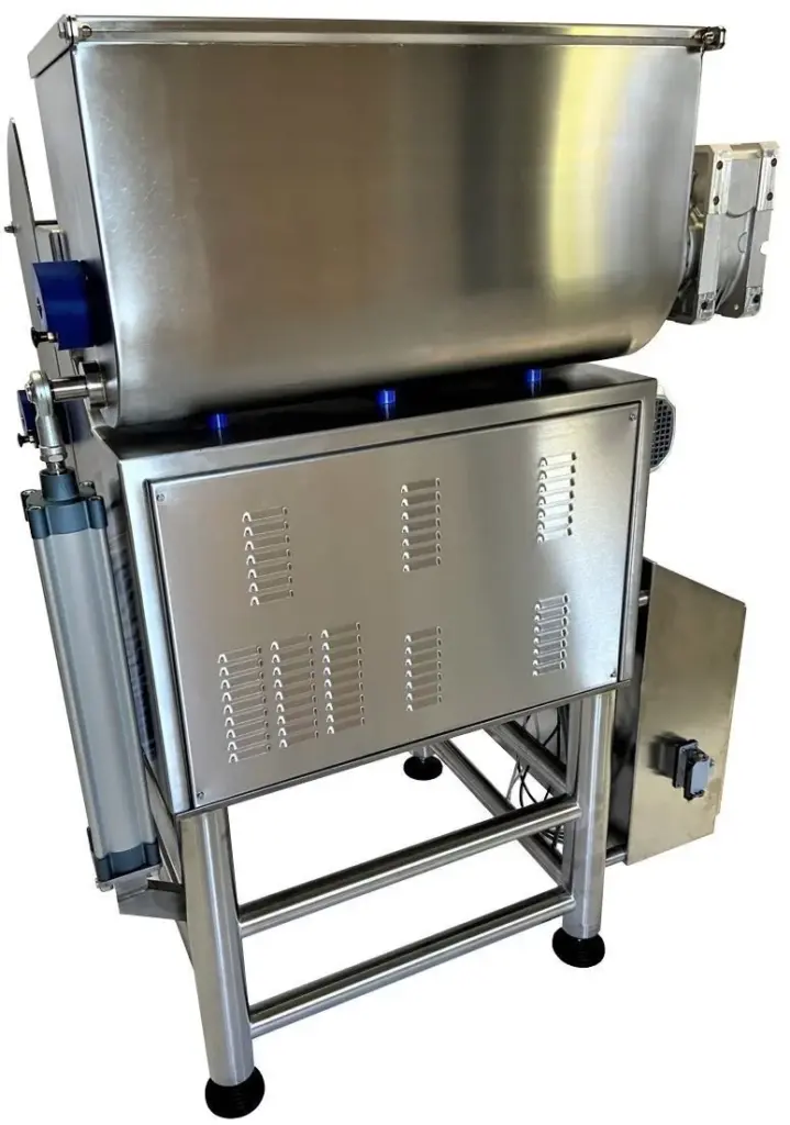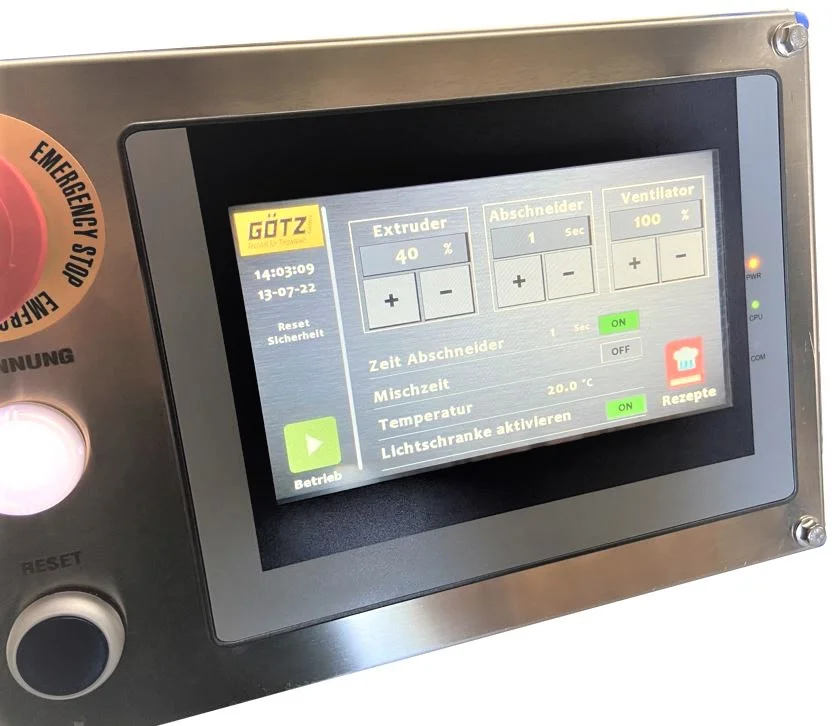 Für externe Reinigungstätigkeiten können die Mischwellen der beiden Mischwannen sowie die Extrusionsschnecke im Extrusionskanal, mühelos und rasch der Maschine entnommen werden. Neben den offensichtlich im Hygienic-Design gehaltenen Komponenten, wie dem Untergestell aus Edelstahl-Rohrprofilen sowie dem Edelstahl-Schaltkasten mit blauer Gummidichtung und Schrägdach, ist auch das Bedienpult aus Edelstahl produziert und ist mit einer Dichtung versehen. Hier befindet sich auch das robuste 7″ Touchscreen, über welches, neben der Steuerung der Lüfter-, Extrusions- und Abschnediegeschwindigkeit, eine Vielzahl von Parametern konfiguriert und für verschiedene Produktionsmodi abgespeichert werden können.