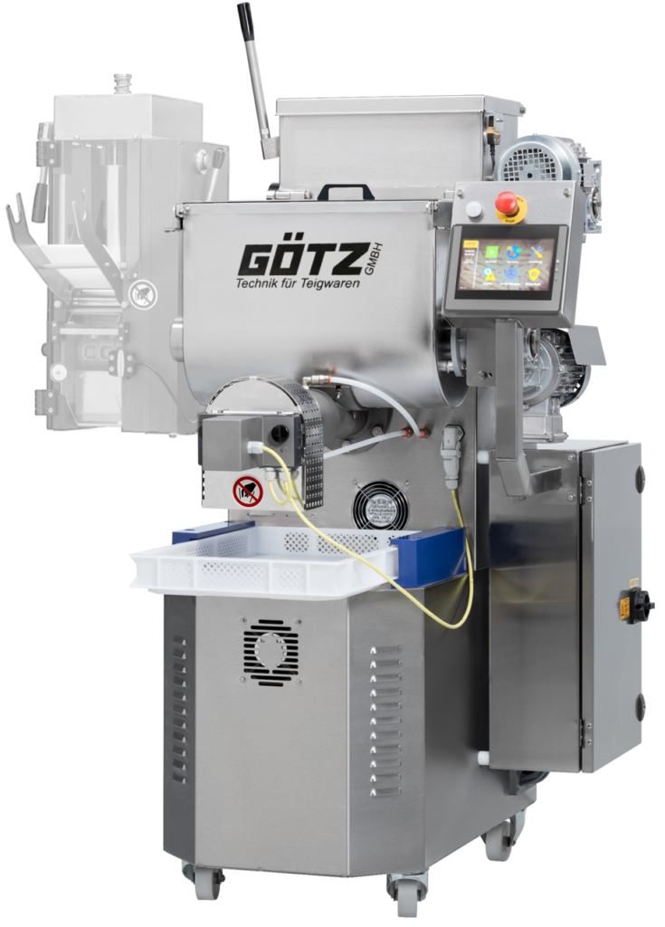 Die Maschine ist zudem mit einer speziellen Matrize in der Lage, Flachteig für die Weiterverarbeitung zu Tagliatelle oder Ravioli / Maultaschen zu produzieren. Der gepresste Flachteigstrang kann während der Produktion automatisch, mithilfe des optionalen Aufrollgeräts, auf blaue Kunststoff-Teigrollen aufgerollt werden.
