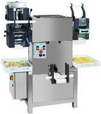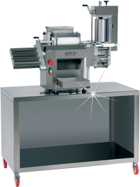 Sobald zwei Teigrollen mit Flachteig produziert wurden, können diese bei der P-55-TR-G in die vorgesehenen Halterungen der Ravioligruppe eingelegt werden. Die auf Basis der RS-120-G abgeleitete Einheit ist in der Lage, 120 mm breiten Flachteig plus Füllung in verschiedene Formen und Größen von Ravioli und Maultaschen zu verarbeiten. Hierzu gibt es eine Vielzahl von Formstempel, welche für die Reinigung, zusammen mit dem Füllungszylinder und Dosiertrichter, nach der Produktion ganz einfach ausgebaut und gereinigt werden können.